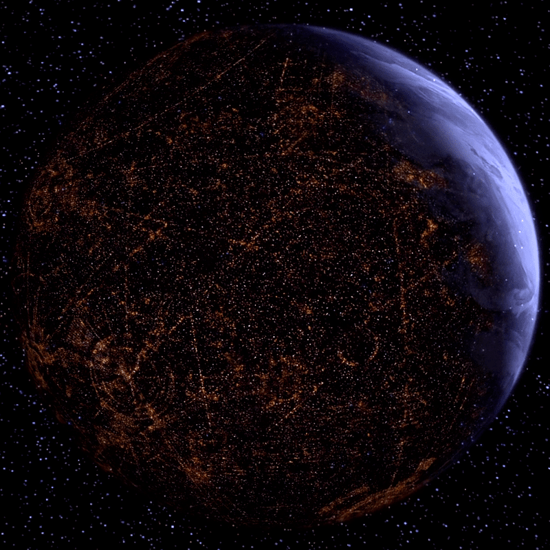 Coruscant’s surface is a massive ecumenopolis, a planet-spanning city called Galactic City. Dense city blocks built on top of one another, encompassing thousands of levels built up over generations. Its highest level is a maze of tall skyscrapers, sky-speeder routes, and sleek transperisteel structures standing next to and above the older duracrete buildings. The lower one descends through the levels of Galactic City, the more stark the difference in economic class; the upper levels belong to the wealthy elite, while those below live in increasing poverty. The lowest levels are barely habitable, if at all, and rumors of mutated creatures who may have once been human living in the darkness below have persisted through generations.