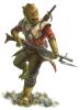 Trandoshans are sentient humanoids with smooth, scaly skin hailing from the planet Trandosha. They are powerful beings with advancing healing factor, able to regenerate entire limbs such as their long thin arms that end in either three thick digits, or four thin digits including a thumb. Their eyes are set back on a pointed skull, and their jaws are filled with pointed canines. Trandoshans often walk barefooted, with three-digit feet. A Trandoshan’s skin color may vary widely, including green, red, orange, brown, or yellow tones. Trandoshans use their sharp claws to climb tall trees in the forest or jungles they naturally inhabit.